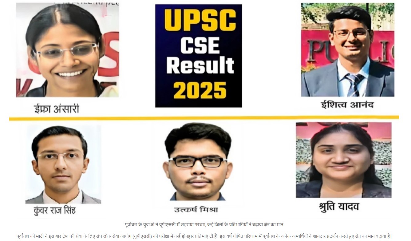 पूर्वांचल के युवाओं ने इस वर्ष संघ लोक सेवा आयोग (UPSC) की परीक्षा में शानदार प्रदर्शन करते हुए पूरे क्षेत्र का गौरव बढ़ाया है। घोषित परिणाम में बलिया, भदोही, चंदौली, गाजीपुर, आजमगढ़, जौनपुर और सोनभद्र समेत कई जिलों के अभ्यर्थियों ने सफलता हासिल कर क्षेत्र का नाम रोशन किया।